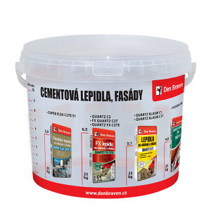 Pro míchání sypkých pytlovaných hmot značky Den Braven s vodou. Na kbelíku je potisk s různými pytlovanými hmotami Den Braven a s vyznačenou spotřebou vody pro míchání materiálů.