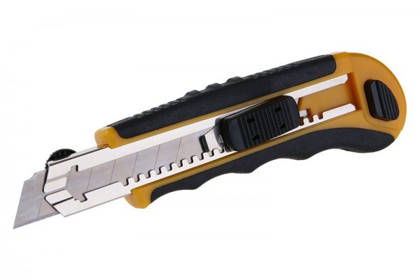 Kovový nůž s výsuvnou lichoběžníkovou čepelí, čepel uchycena uvnitř těla nože na posuvném jezdci, ergonomický tvar, tlačítko pro snadnou a rychlou výměnu čepele, drážka na řezání provázku, odizolovávání vodičů…, 2 náhradní čepele.