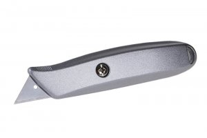 Kovový nůž s pevně uchycenou lichoběžníkovou čepelí, čepel uchycena uvnitř těla nože.