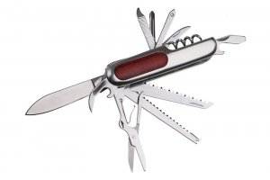 Nůž kapesní multifunkční INOX. Délka zavřeného nože 95 mm. Nerezový multifunkční nůž s 11 různými částmi pro různé způsoby použití. Rukojeť v kombinaci kov - dřevo. Hmotnost 0,666 kg.
