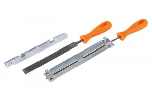 Ostření pilových řetězů mnoha běžných velikostí. S tímto vodítkem pilníku je zcela jednoduché naostřit řetěz, dodržet úhel a hloubku ostření. Průměr kulatého pilníku v sadě je 4 mm.