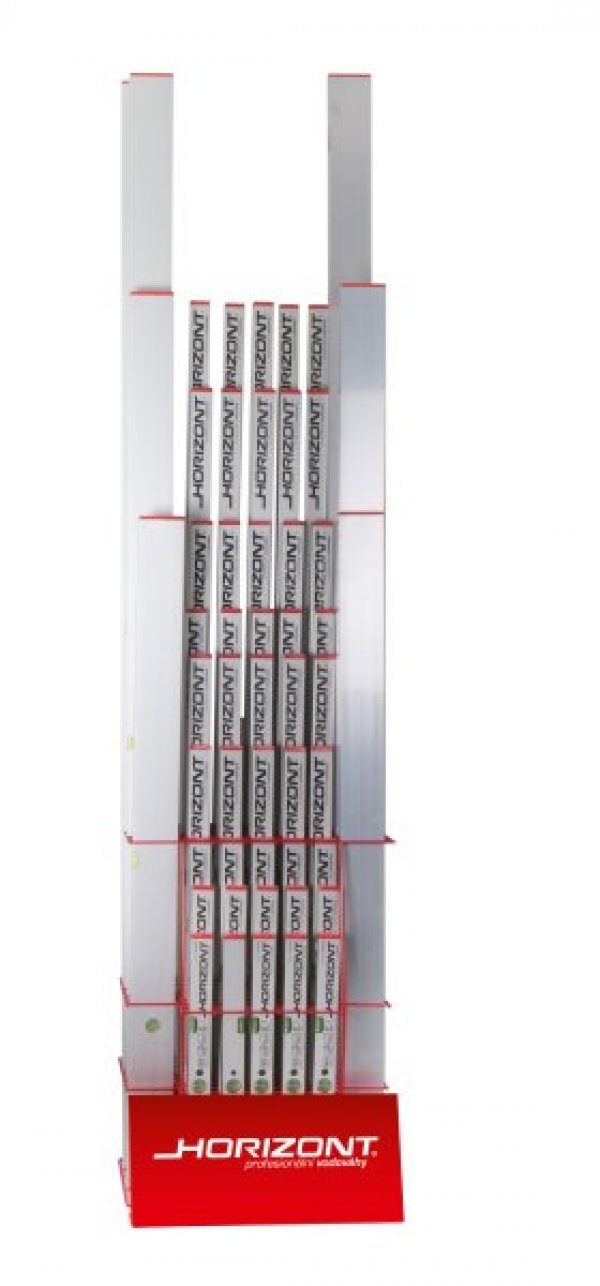 Stojan osazený produkty pro prezentaci profesionálních vodováh HORIZONT. Dle statistik navýší prezentace na stojanu prodej vodováh o min. 30%.Podobné produkty