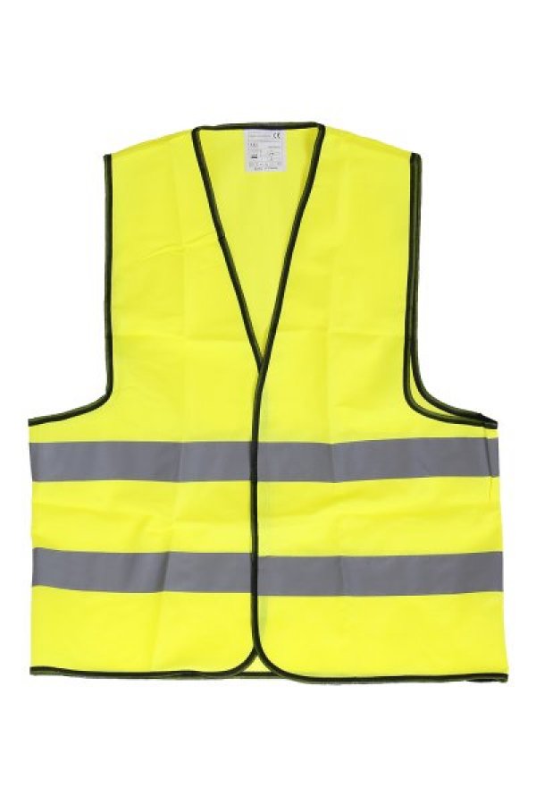 Žlutá polyesterová výstražná vesta, 2 horizontální reflexní pruhy, zapínání na suchý zip, velikost UNI, CE EN 471.