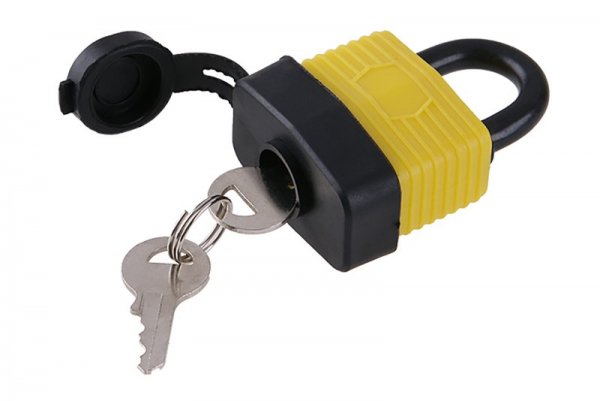 40mm ocelové tělo potaženo plastem pro maximální odolnost proti vodě a vlhkosti. Oblouk tvrzené oceli potažený plastem pro lepší odolnosti proti prořezání Váha: 140g 2 ocelové klíče.